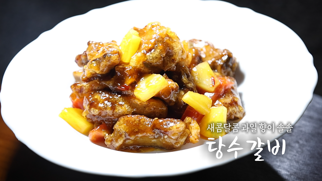 재료: 돼지등갈비, 케첩, 꿀, 설탕, 식초, 레몬, 파인애플, 방울토마토