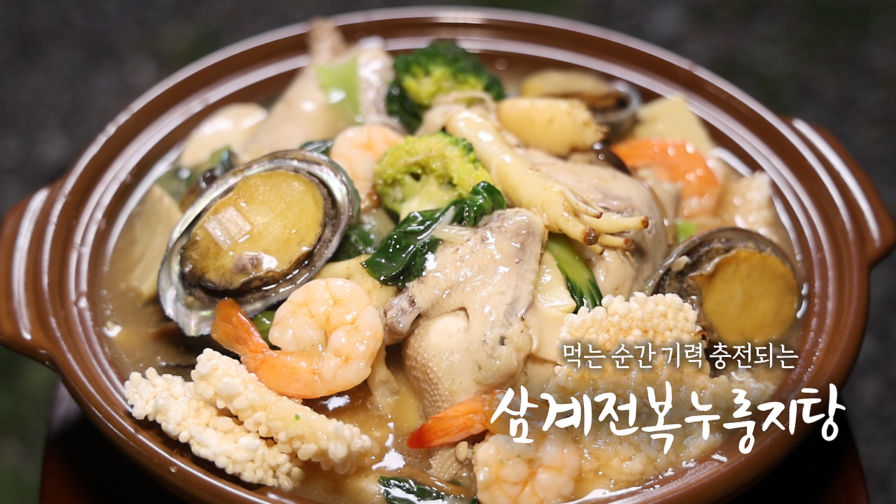 재료: 생닭, 전복, 인삼, 다진마늘, 생강, 대파, 청경채, 죽순, 표고버섯, 새송이버섯, 팽이버섯, 새우
