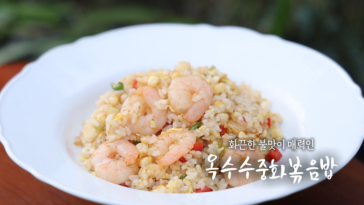 재료: 옥수수, 밥 2공기(400g), 달걀 2개, 대파, 피망, 양파, 버터, 치킨 파우더(1작은술), 소금(1/2 작은 술), 후추