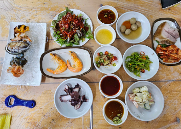 물레야소주방은 ‘반다찌’ 스타일로 운영되며, 1인 기준으로 다양한 해산물 요리와 수육, 생선구이, 조림 등 다채로운 메뉴가 순차적으로 제공됩니다. 굴, 멍게, 전복, 피조개 등 생 해물은 물론, 꼼장어 수육과 병어조림, 아귀수육까지 이어지는 구성은 그야말로 통영의 바다를 그대로 옮겨놓은 듯한 풍성함을 자랑합니다. 특히 묵은지와 함께 제공되는 고기류는 깊은 감칠맛을 더하며, 특제 양념장과 함께 즐기는 해산물은 술안주로도 제격입니다.