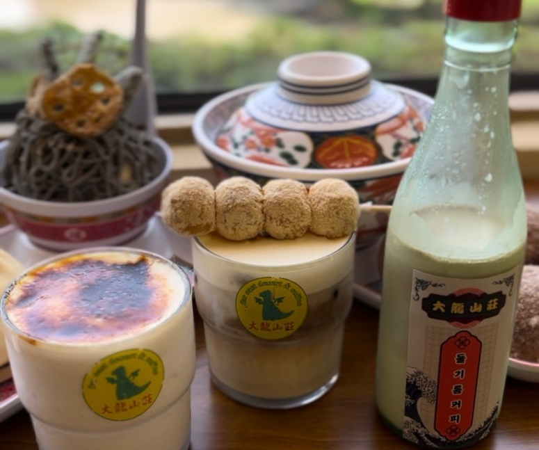 대룡산장은 춘천에서만 만날 수 있는 이색 메뉴 중심의 카페로, 기존의 카페와는 차별화된 독창적인 메뉴를 선보이는 공간입니다. 대표 메뉴인 들기름 막국수 아이스크림은 흑임자 아이스크림과 함께 제공되어 고소하고 건강한 맛을 자랑하며, 전국에서도 보기 드문 조합으로 화제를 모으고 있습니다. 이 외에도 들기름 눈꽃빙수, 대룡소룡포빵, 당고라떼, 구운우유, 야끼소바빵, 명란크림치즈빵 등 독특한 메뉴들이 다양하게 준비되어 있어 방문객들에게 색다른 즐거움을 선사합니다.