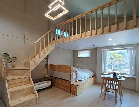 숙소는 복층 구조의 12.5평 독채로 구성되어 있으며, 다락이 있어 아이들과 함께하는 가족 여행에도 안성맞춤입니다. 매일 깨끗한 침구로 교체되며, 아침에는 갓 구운 식빵과 소시지, 계란, 커피로 구성된 무료 조식이 제공되어 하루를 기분 좋게 시작할 수 있습니다. TV, 에어컨, 전자레인지, 전기밥솥, 다이슨 에어랩 등 생활 편의 시설도 완비되어 있어 장기 숙박에도 불편함이 없습니다.