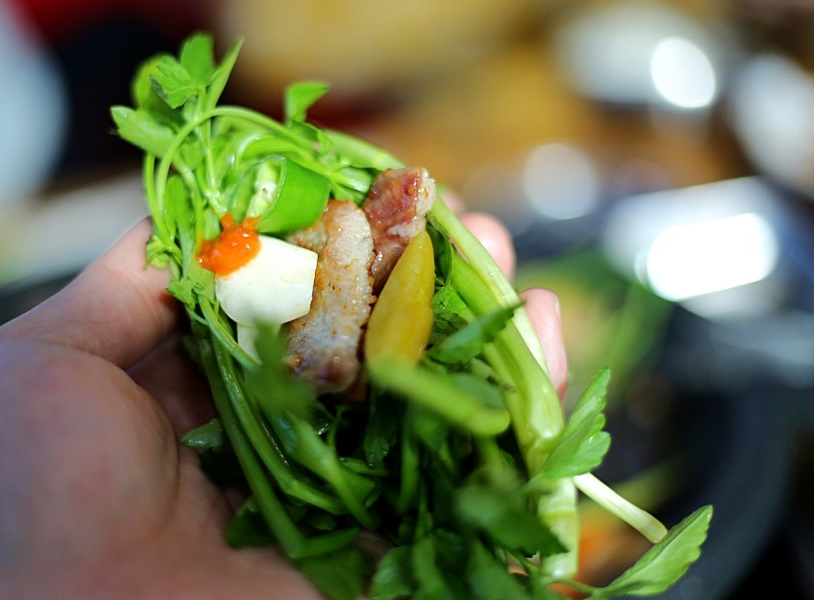 삼겹살의 기름진 맛과 고소한 풍미가 미나리의 상큼하고 아삭한 식감과