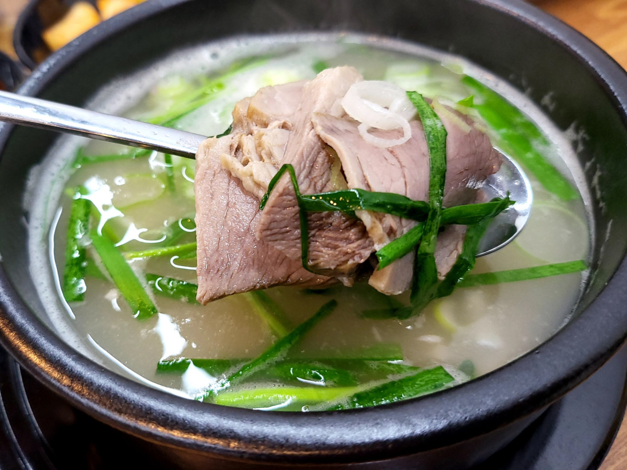 깔끔하고 뜨끈한 국물에 신선한 고기가 가득한 돼지국밥은