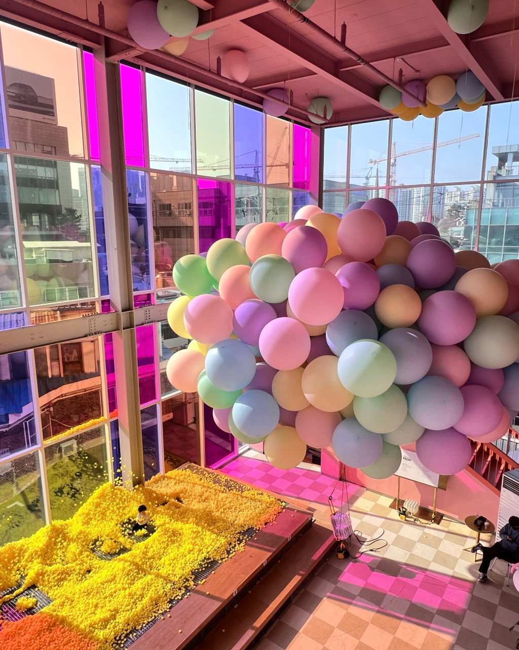 카페 내부는 오렌지와 파스텔 핑크톤으로 꾸며져 아기자기하고 안락한 분위기를 자아낸다. 1층은 ‘비비 메인 플로어’로, 스테인드글라스를 통해 변화하는 빛의 색감을 즐길 수 있다. 2층은 ‘비비 아치플로어’로, 선명한 색감의 아치 구조물과 팝아트 그림들이 갤러리 같은 느낌을 준다. 각 층마다 포토존이 마련되어 있어 사진 촬영의 재미를 더한다.
