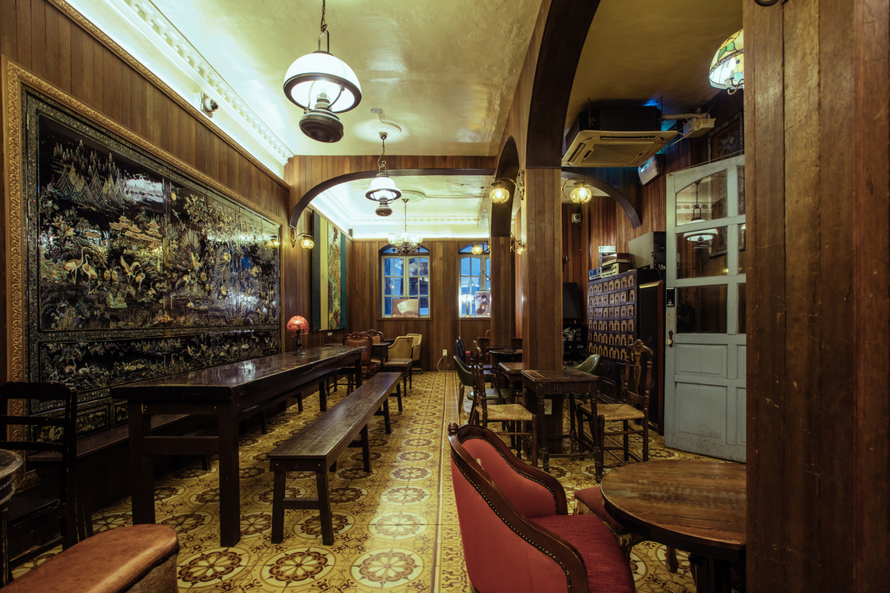 카페 내부는 고풍스러운 인테리어로 꾸며져 있으며, 주인장이 직접 수집한 샹들리에, 자개장, 한약재를 담는 서랍장, 괘종시계 등 다양한 소품들이 개화기의 분위기를 자아냅니다. 커피한약방에 들어서면 구수한 커피 향과 함께 벽면의 커다란 자개장에 마음을 빼앗기게 됩니다. 특히, 1900년대에 만들어진 네 폭짜리 자개장과 송나라 때 제작된 고나무 테이블은 이 카페의 자랑거리입니다.