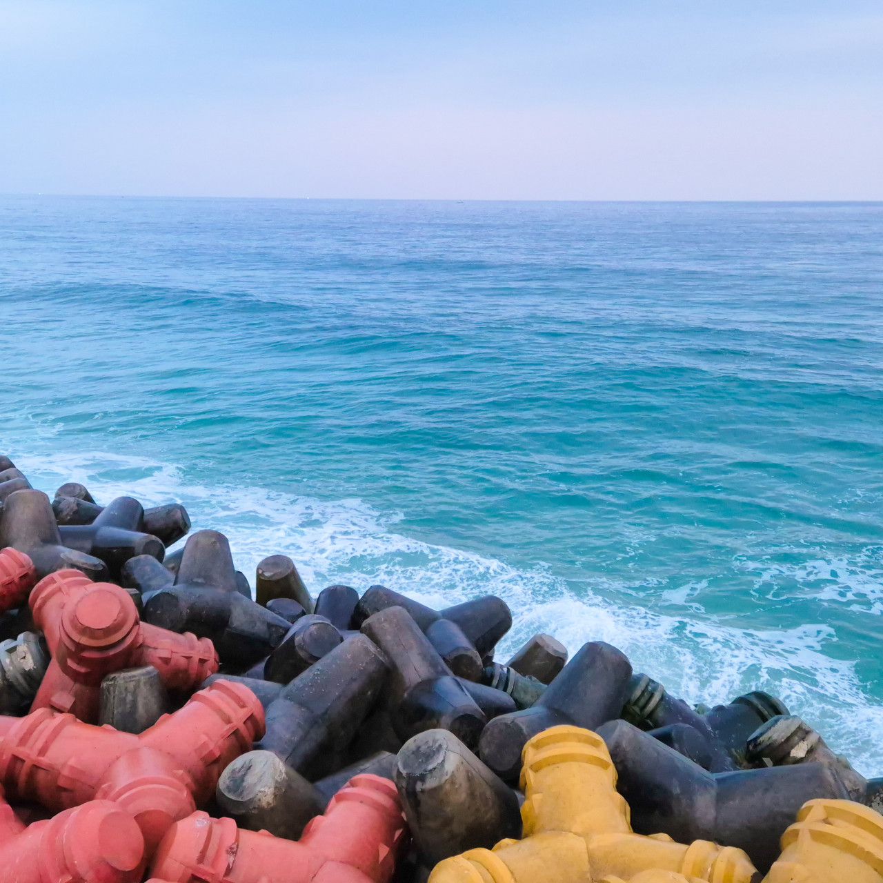 특히 이곳의 매력은 빨강, 노랑, 파랑으로 물든 알록달록한 테트라포드입니다. 푸른 바다와 화려한 색상이 조화를 이루어 멋진 포토존을 형성하고 있어, 많은 사람들이 전망대 끝자락에서 사진을 찍기 위해 줄을 서는 모습을 쉽게 볼 수 있습니다.