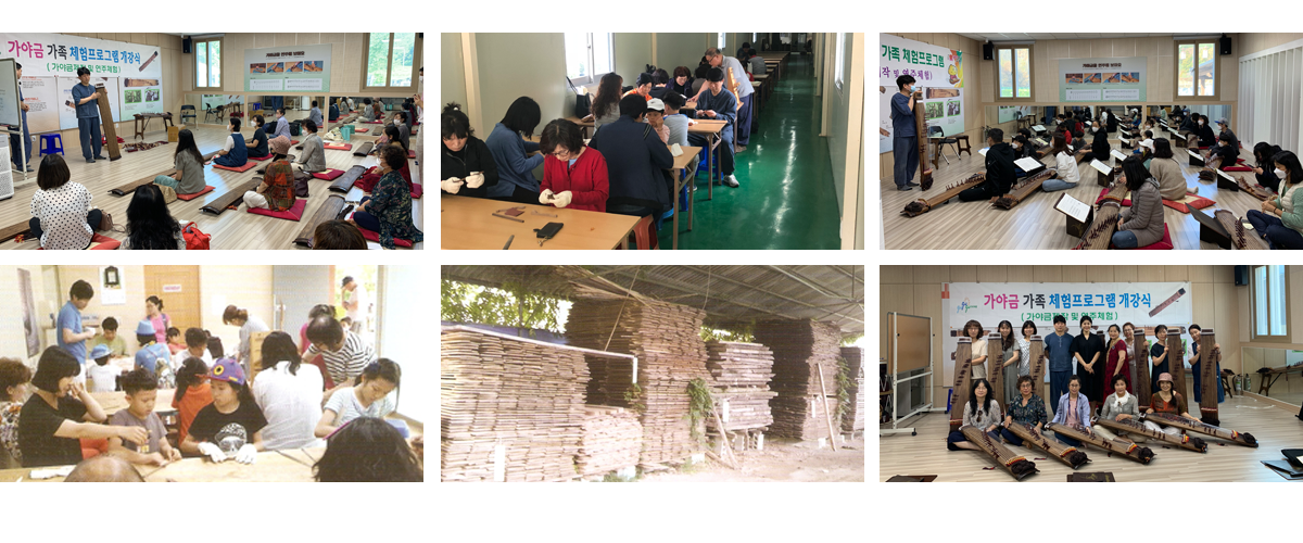 이곳에서는 가야금 제작 및 연주체험 프로그램을 진행하고 있습니다. 이 프로그램은 참가자들이 전통 악기인 가야금을 직접 만들고 연주함으로써, 한국의 전통 음악과 문화를 깊이 이해하고 체험할 수 있는 기회를 제공합니다.
