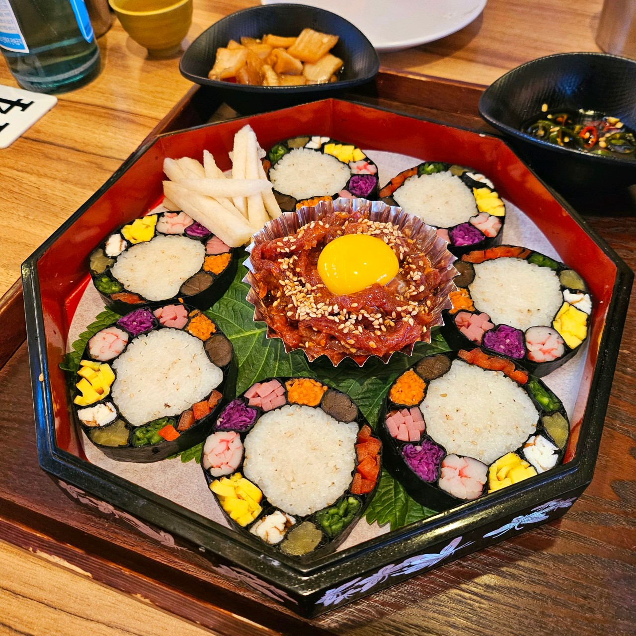 특히 보석처럼 반짝이는 보석 육회 김밥과 전국의 전통주를 한 잔씩 마셔볼 수 있는 대동여지도주는 맛과 향으로 입을 즐겁게 해주며, 특별한 경험을 선사합니다. 매장은 1층과 2층으로 나뉘어 있어 자리가 넉넉해 혼자서도, 친구들과 함께 오기에도 편리합니다. 음식의 비주얼과 맛, 그리고 인테리어가 모두 아름다워 분위기 있는 식사를 즐길 수 있습니다.