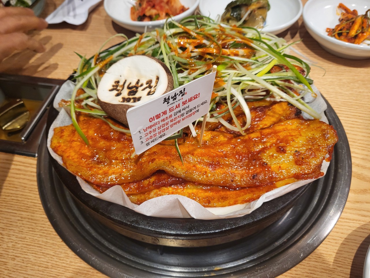 청남집의 주 메뉴인 고추장삼겹살은 달콤하고 매콤한 고추장 양념에 재운 고기가 숯불에서 구워져 부드럽고 촉촉한 식감을 자랑합니다. 이 고추장삼겹살은 미리 거의 다 구워져 나와 손쉽게 데워 먹을 수 있어 고객 편의성을 고려한 조리법이 인상적입니다. 특히, 남해바다 해초류와 김에 싸서 먹거나 묵은지와 함께 곁들여 먹는 방법은 특별한 맛을 더욱 강조합니다.