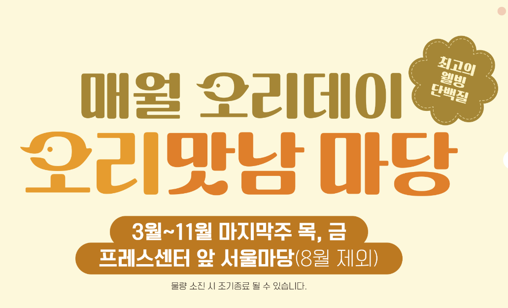 한편, '매월 오리데이'는 "매월 마지막 주에는 꼭 오리고기를 먹자"는 취지로 기획된 정기 소비촉진 행사로, 매월 마지막 주 목요일과 금요일에 서울마당에서 개최됩니다.