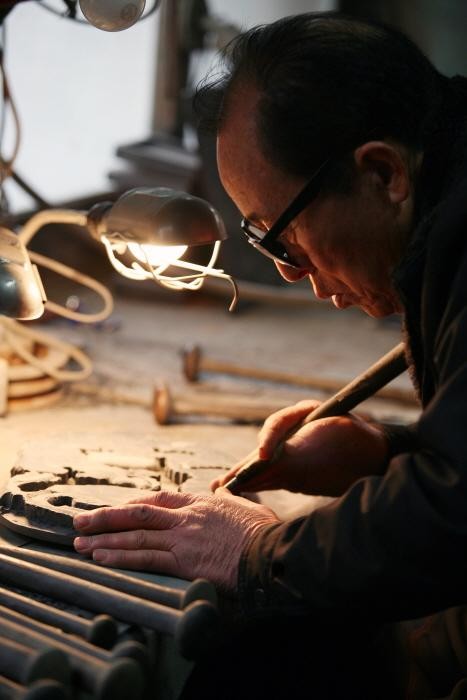 "말은 물을 가로질러 가다 죽지만, 소는 물 흐르는 대로 따라가 절대 죽지 않는다"는 김 명장의 철학처럼, 그는 서두르지 않고 순리에 따라 좋은 돌을 찾아 정성을 다해 벼루를 만듭니다. 조부 김형수 옹부터 부친 김갑용 선생에 이르기까지 3대에 걸쳐 이어온 남포벼루 제작 기술은, 1987년 김 명장이 충청남도 무형문화재 6호로 지정되고 1996년 대한민국 명장으로 인정받으며 그 가치를 더욱 빛내고 있습니다.