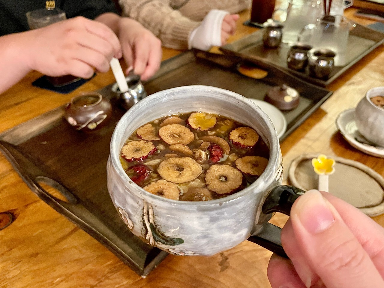 카페에 들어서면 계단 오른쪽에 위치해 있으며, 다양한 다도 용품이 전시되어 있습니다. 실내는 모던한 인테리어와 고급스러운 목재가 조화를 이루어 넓고 쾌적한 공간을 제공합니다. 메뉴는 디저트 없이 음료와 전통 차로 구성되어 있으며, 핫과 아이스 모두 가능해 다양한 선택이 가능합니다. 보기 힘든 차 종류도 있어 더욱 매력적입니다. 이곳은 볼거리가 많고, 세련되고 예쁜 인테리어가 인상적이며, 특히 나무 기둥이 공간을 멋스럽게 분리해 주어 아늑한 분위기를 더합니다.