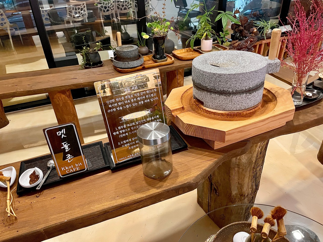 서산 해미읍성에 위치한 이색 체험 카페 '꽃빛'은 전통 찻집의 매력을 현대적으로 재해석한 공간입니다. 이곳에서는 신선한 원두를 맷돌로 직접 갈아 핸드드립 커피를 즐길 수 있어, 커피의 향이 더욱 풍부해집니다. 잘 갈아진 원두는 붓으로 조심스럽게 모아 원두가 담겨 있던 그릇에 담고, 사장님께 가져다드리면 맷돌 커피를 핸드드립으로 내려주십니다. 아이스로 주문한 맷돌 커피는 얼음이 든 큰 잔과 작은 잔으로 제공되며, 큰 잔에 커피를 부어 마실 때 얼음이 녹으면 더 채울 수 있도록 여분의 얼음도 챙겨주시는 세심한 배려가 돋보입니다.