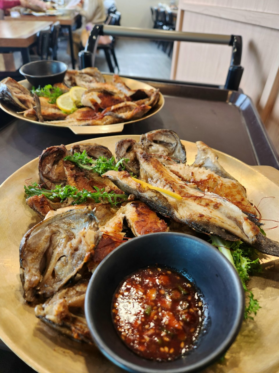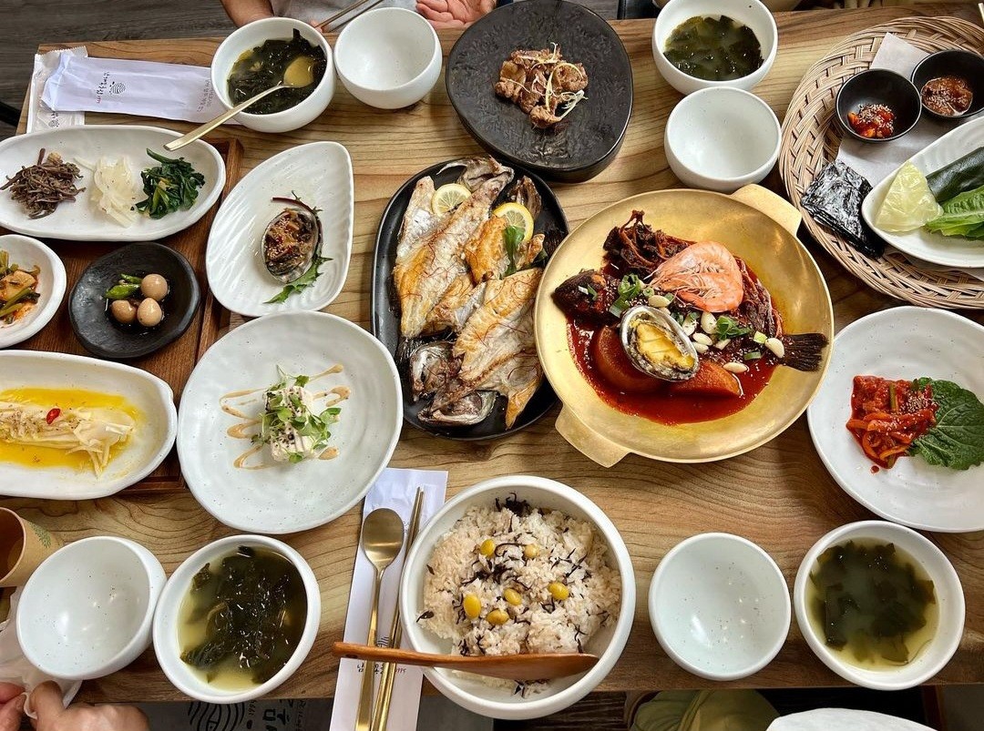 기본찬으로는 총각김치, 몰(콩나물+몰 무침), 톳나물 두부 무침, 멸치볶음, 갓절임 등이 제공됩니다. 또한, 남해 꼬막, 석화, 연두부, 황태 미역국, 양념게장, 자연산 해삼, 경상도식 나물밥(두부, 새우, 무나물, 고사리, 시금치, 미역) 등 푸짐한 곁들임 메뉴를 맛볼 수 있습니다. 밥은 톳 은행 찰보리쌀밥으로 제공되며, 오징어젓갈, 갈치속젓, 초장, 상추, 배추, 김 등과 함께 밥소쿠리에 담겨 제공됩니다.