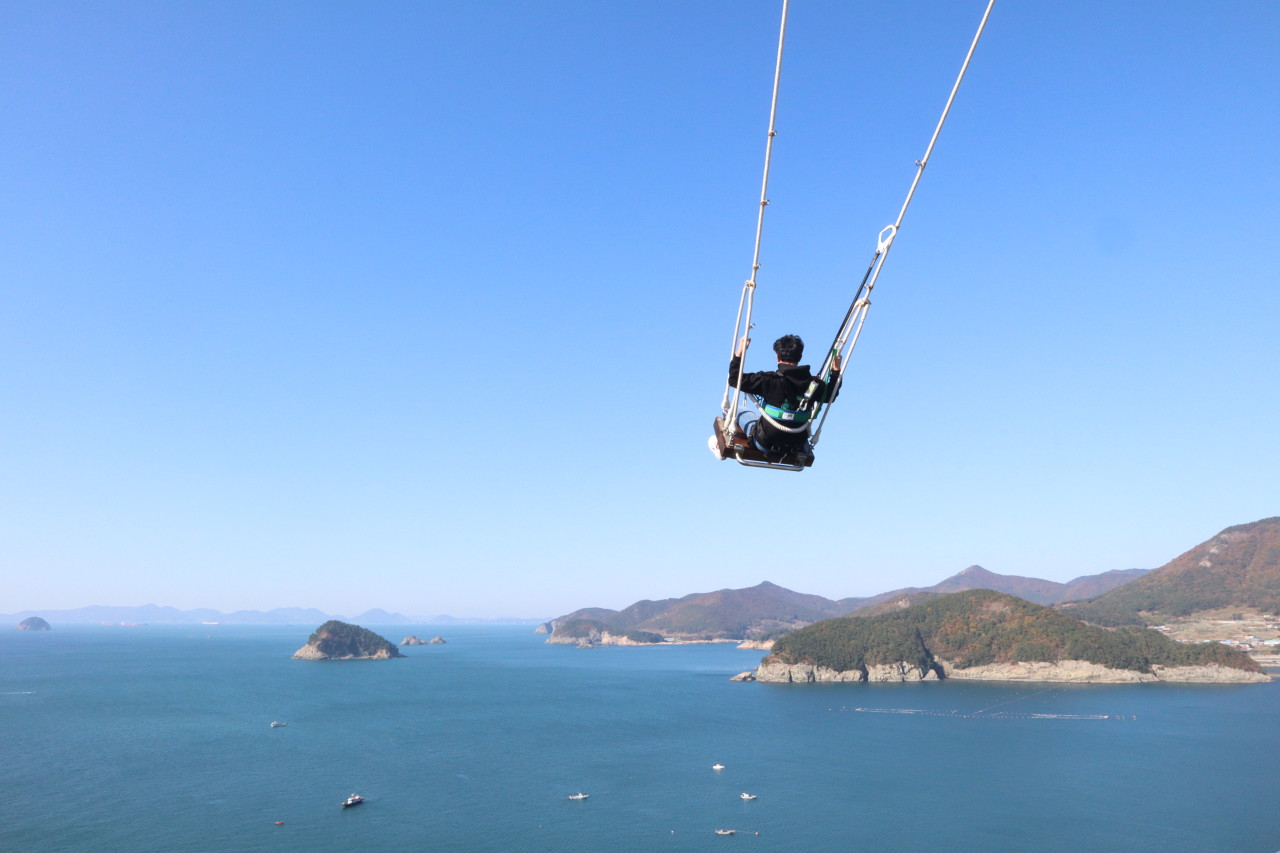 스카이워크 끝자락에는 인도네시아 발리의 명물인 '발리 스윙'을 모티브로 제작한 스릴 넘치는 '스윙 그네'가 자리하고 있습니다. 38m 높이에서 즐기는 그네는 마치 하늘을 나는 듯한 아찔함과 함께 탁 트인 남해 바다를 가슴 벅차게 조망할 수 있는 기회를 제공합니다.