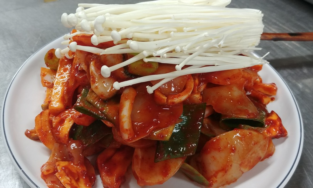 깍둑썰기 한 버터 한 덩이를 철판에 녹인 후 관자와 버섯을 굽는 키조개 버터구이는 버터를 머금은 관자의 바닥이 노릇노릇 갈색을 띠면 바로 뒤집고 불을 끄는 것이 포인트입니다. 철판에 볶은 돼지두루치기는 흔하지만, 키조개두루치기는 특별한 경험을 선사합니다.