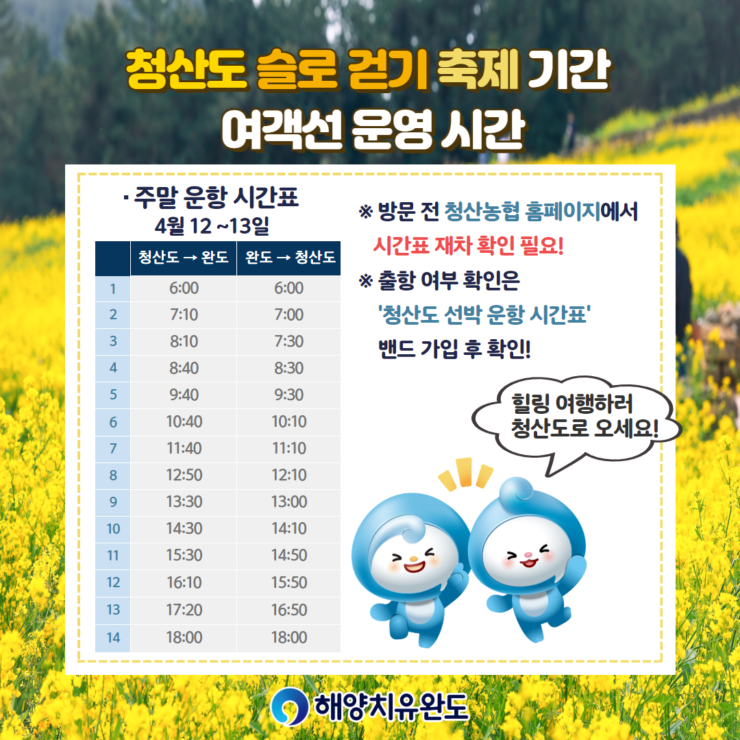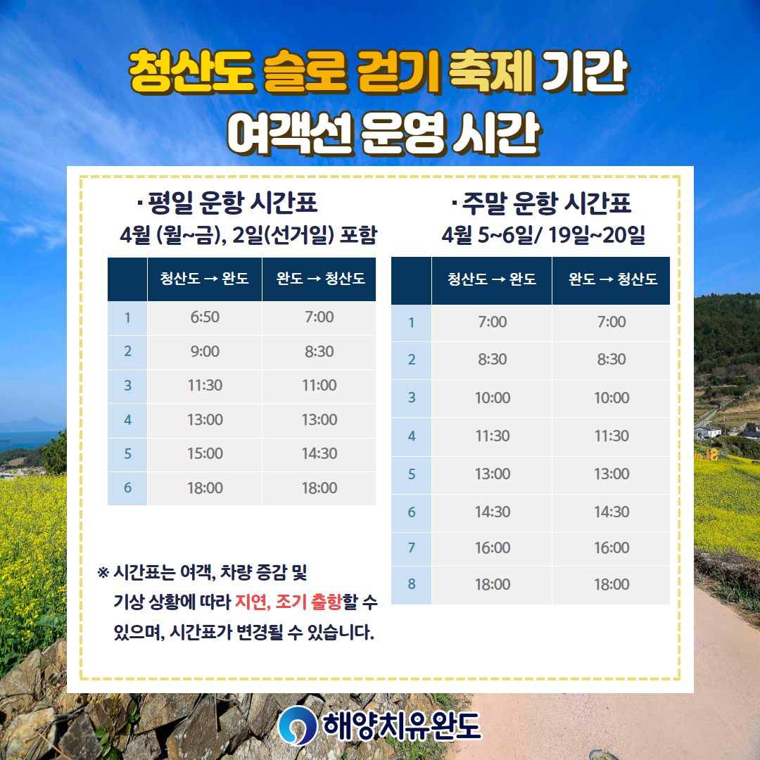 - 섬 여객선 반값: 완도 방문의 해를 맞아 섬 여객선 요금이 반값으로 할인됩니다.