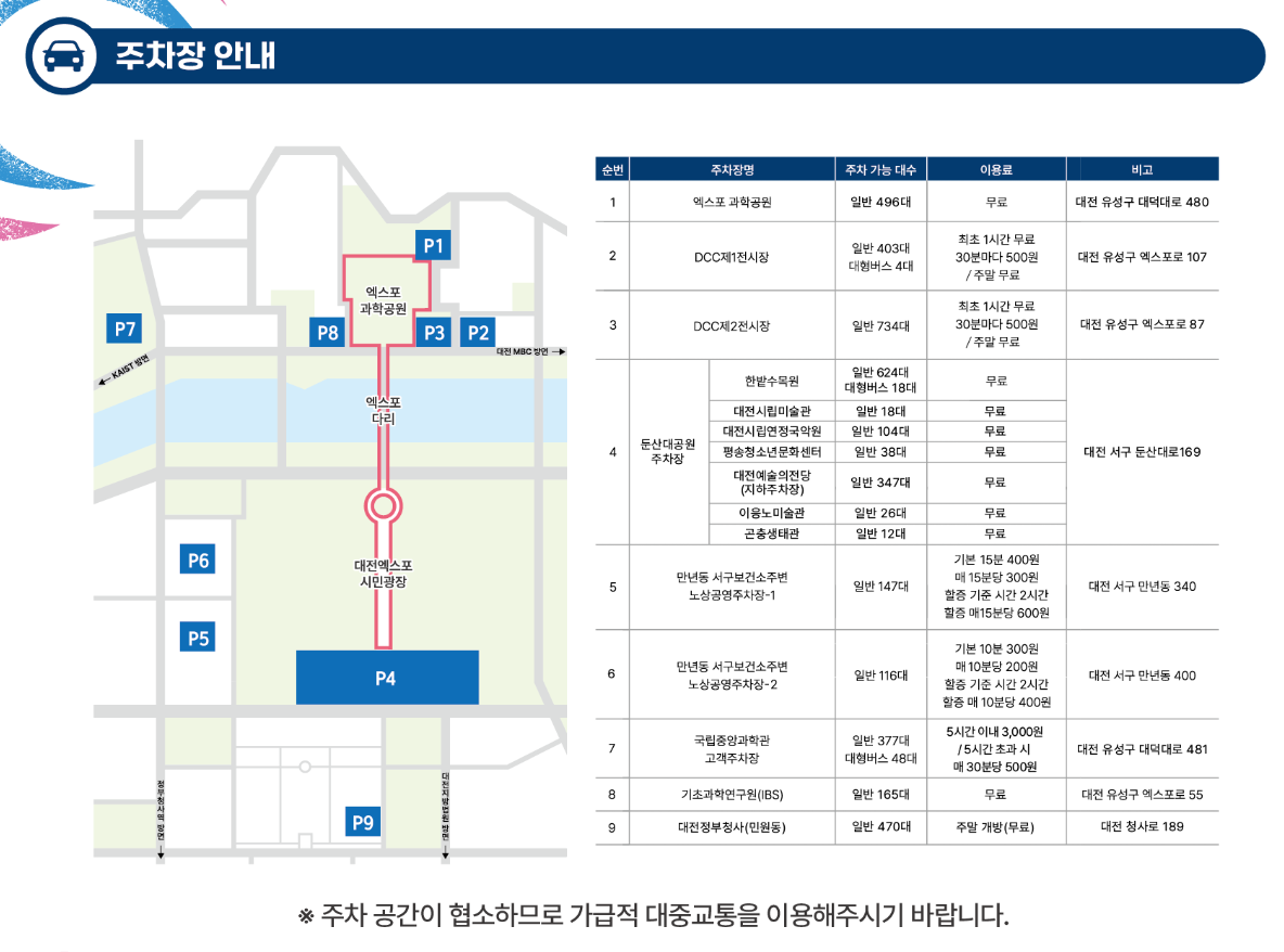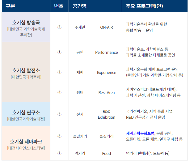- 먹거리존/오픈마켓: 21:00까지 운영 (엑스포과학공원, 갑천변 등 일대)