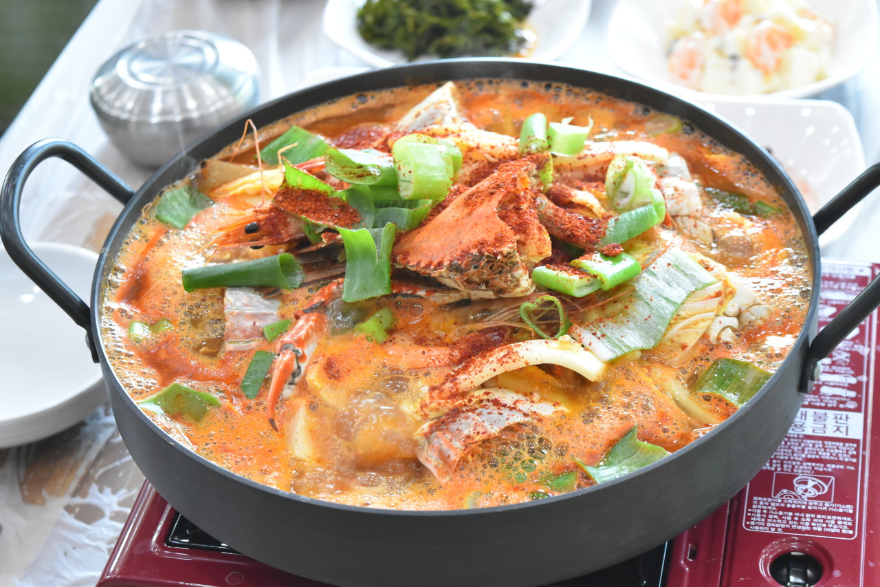 바다산성의 대표 메뉴인 게국지는 꽃게, 묵은지, 다양한 해산물, 그리고 육수를 푹 끓여 만든 충청도식 향토 음식으로, 깊고 진한 국물 맛과 개운한 뒷맛이 특징입니다. 함께 제공되는 밥과 곁들여 먹으면 봄철 입맛을 돋우기에 충분하며, 시원하면서도 칼칼한 풍미로 남녀노소 모두에게 사랑받고 있습니다.