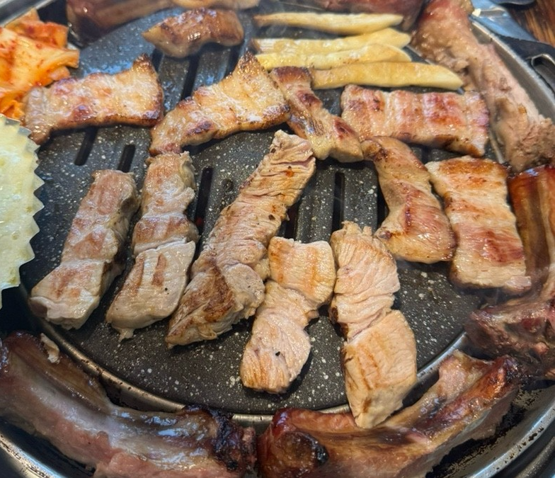 이곳의 고기는 국내산 돼지고기 중에서도 듀록 품종만을 사용하여 깊은 풍미와 육즙을 자랑하며, 삼겹살과 목살은 장시간 교차 숙성되고 다양한 숯으로 초벌되어 고소한 향이 살아 있습니다. 특히 시그니처 메뉴인 폭립은 김해 금관가야의 왕관을 모티브로 디자인되어 압도적인 비주얼을 자랑하며, 전통 아궁이 방식에 장작과 맥반석을 활용해 장시간 훈연한 텍사스 바비큐 스타일로 완성됩니다. 직원이 포토타임을 안내해 멋진 사진을 남긴 후 즐길 수 있습니다.