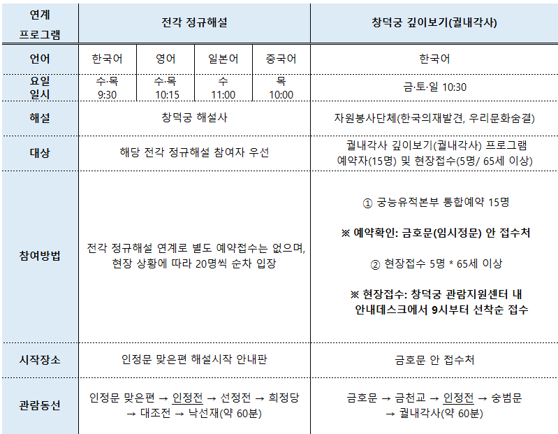 - 금·토·일요일: ‘창덕궁 깊이보기(궐내각사)’ 심화해설 (한국어: 10:30)