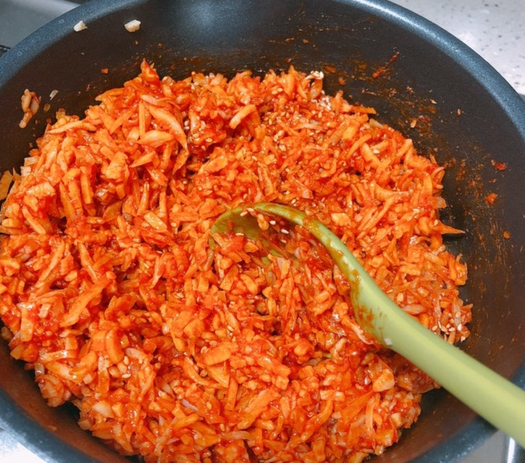 4. 불을 끄고 참기름과 통깨를 넣고 섞어 마무리한다
