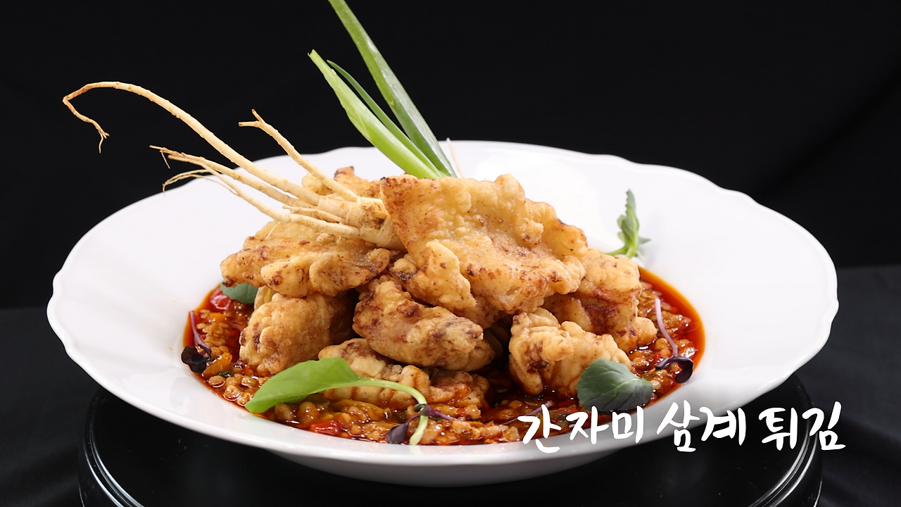재료: 간자미, 인삼, 닭, 다진 고기, 다진 마늘, 소금, 설탕, 후추, 식용유, 감자전분, 달걀, 파프리카, 고추, 두반장