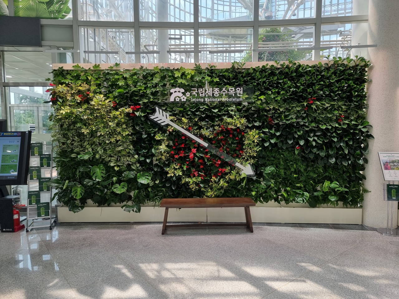 이곳의 대표적인 식물은 스킨답서스입니다. 스킨답서스는 관리가 쉽고 병해충에 대한 저항성이 강한 식물로, 실내 공기 정화 기능이 뛰어납니다. 특히, 어두운 곳에서도 잘 자라는 특징이 있어 실내 공간을 녹색으로 꾸미기에 최적의 식물입니다. 수직 정원에 배치된 다양한 식물들은 단순한 장식 이상의 역할을 하며, 공기 정화와 가습 효과를 통해 환경을 더욱 쾌적하게 만들어 줍니다.