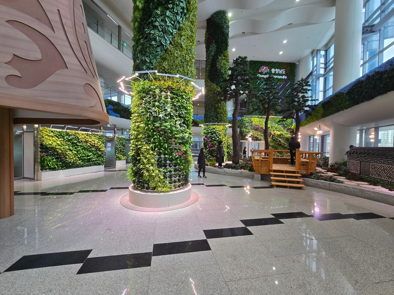 충청남도청에 새롭게 조성된 수직 정원(Vertical Plants Garden)은 단조롭고 칙칙했던 공간을 생기 넘치는 녹색의 공간으로 탈바꿈시켜 눈길을 끕니다. 이 정원은 벽면을 활용하여 식물을 배치함으로써 자연의 아름다움과 기능성을 동시에 살린 디자인입니다. 수직 정원의 개념은 프랑스의 식물학자 패트릭 블랑이 제안한 것으로, 그는 식물이 벽을 따라 자라도록 디자인한 ‘수직의 정원(Vertical Garden)’이라는 표현을 대중적으로 널리 알렸습니다.